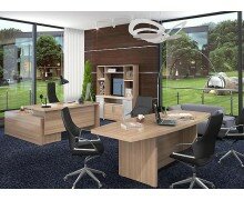 Кабинет руководителя Кабинет руководителя Вектор выполнен из ЛДСП толщиной 48,25 и 16 мм. Изюминку этому комплекту придает окантовка аллюминиевым декором по лицевой стороне стеллажей, колонок и шкафов. Стол руководителя кабинета Вектор отличает монументальность и представительность. В..